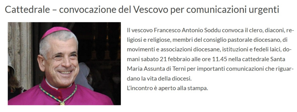 Dando quindi come “archiviato” il cortocircuito comunicativo sulla sede sarda, a due ore dall’Angelus di Sabato 21 Febbraio 2026 l’attenzione torna sul bollettino della Sala Stampa relativamente alla Diocesi di Terni-Narni-Amelia: in questo caso la designazione dell’Amministratore Apostolico potrebbe non essere solamente una mera formalità di transizione, ma anche un indicatore predittivo di quanto potrebbe avvenire in tutta la regione, specie in termini di eventuali unioni in persona episcopi.
