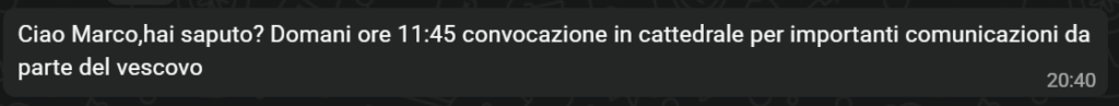 Un’informativa da parte mia era doverosa perché come Ministro Straordinario della Comunione e studente di Teologia “in itinere” si tratta di informare i rispettivi pastori dei progressi del proprio percorso di studi ai fini di un più “coerente” inserimento nella Chiesa locale: nello specifico io sono nato a Terni, ancora domiciliato a Terni, ma ormai residente in Alta Garfagnana, per cui il messaggio con due destinatari.
